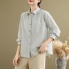 Women Blue Striped Cotton Linen Lapel Long Sleeve Shirt