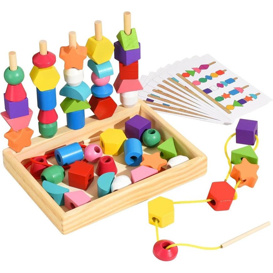The set includes a delightful variety of colored wooden beads in fundamental shapes like spheres, cubes, and cylinders, featuring primary and secondary colors. Threading these beads onto the sturdy wooden rods significantly enhances children's fine motor skills, hand strength, and pincer grip, laying a solid foundation for future tasks like writing.