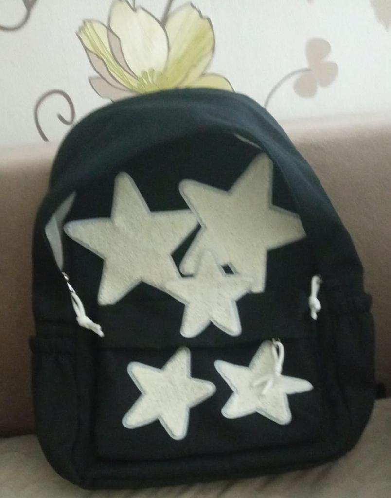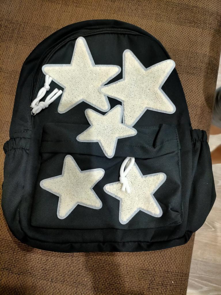 Bonita mochila, algunos hilos sobresalen de debajo de las estrellas, ¡pero todo está bien! bastante espacioso y cómodo ♡