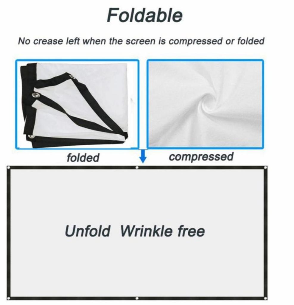2, Hordozható és összecsukható – Ez a vetítővászon prémium szövetből készült, könnyű és hordozható. Hajtsa össze a képernyőt kis méretre, és tegye be a hátizsákba vagy bőröndbe, és vigye bárhová