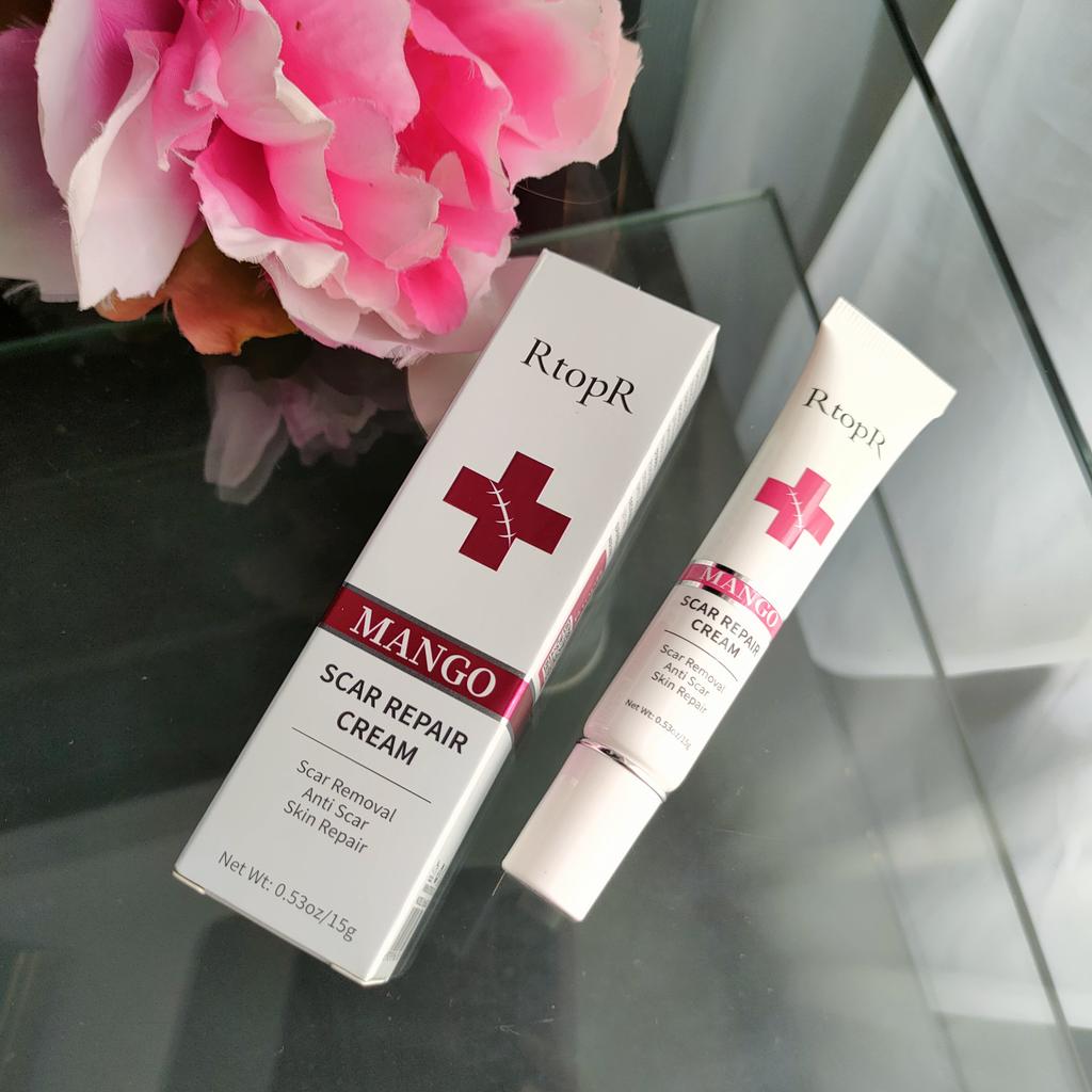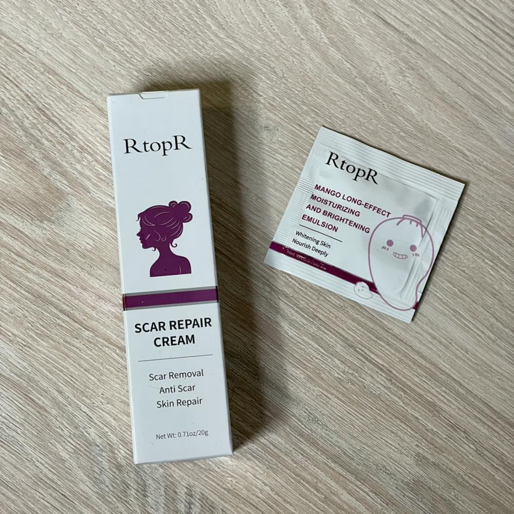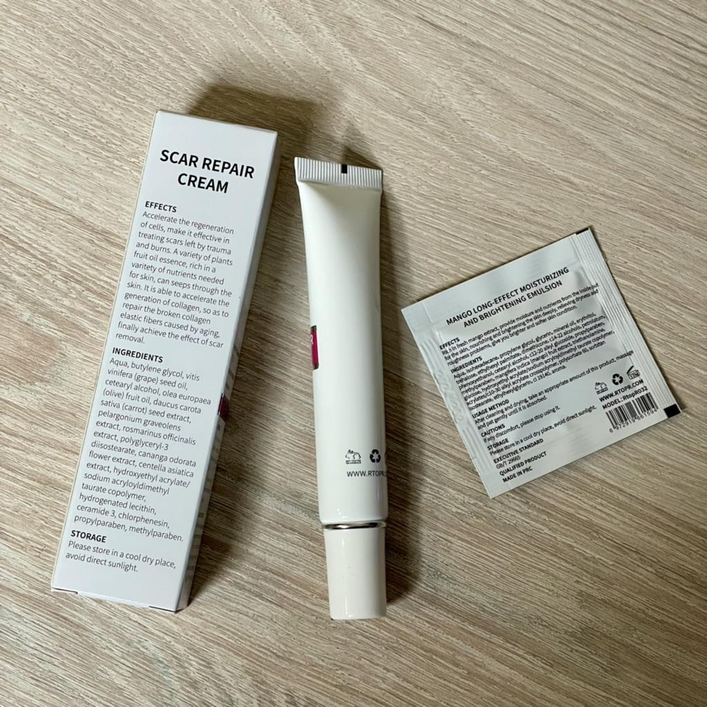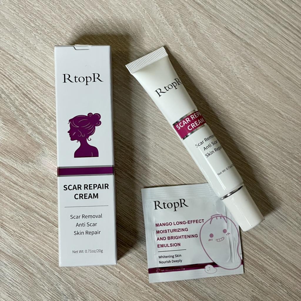 🌺 Scar Cream 🌺 I ordered it for acne scars. I hate it when acne is gone but it leaves its scar for months. I am looking for a good product to fade those away. Actually I ordered many from other brands. ODEO, MeiYanQoing, Mabrem and this one RtopR. I want to check their healing speed and make a comparison. I like this brand especially i like their mango cream texture and smell. 🌺 This cream is for all kinds of scars, like operation scars, traumatic scars, burns, acne scars. 🌺 This cream claims to accelerate regeneration of skin cells. I think it definitely worths to try. Total amount is 20gr.