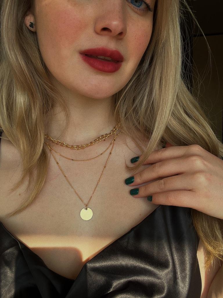 Gold-plated, triple neck chain . Made of some metal that imitates gold. It looks beautiful. It has length adjustment . Delivery to Poland within a month. The product meets my expectations. 100% compatible with the seller's description. I recommend . 😊😊😊 It certainly cannot be soaked 😅😅
