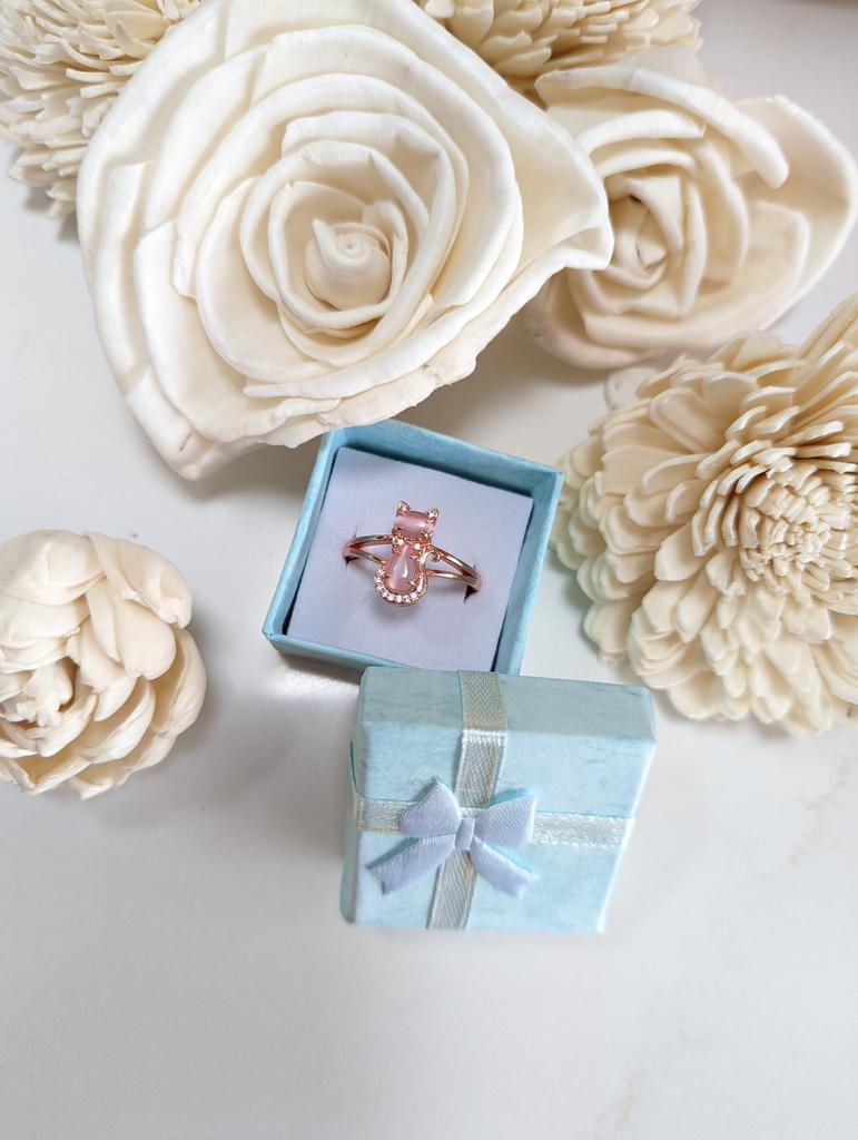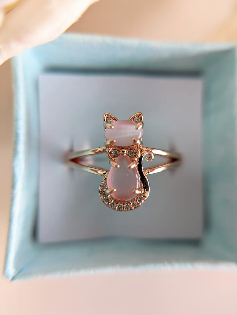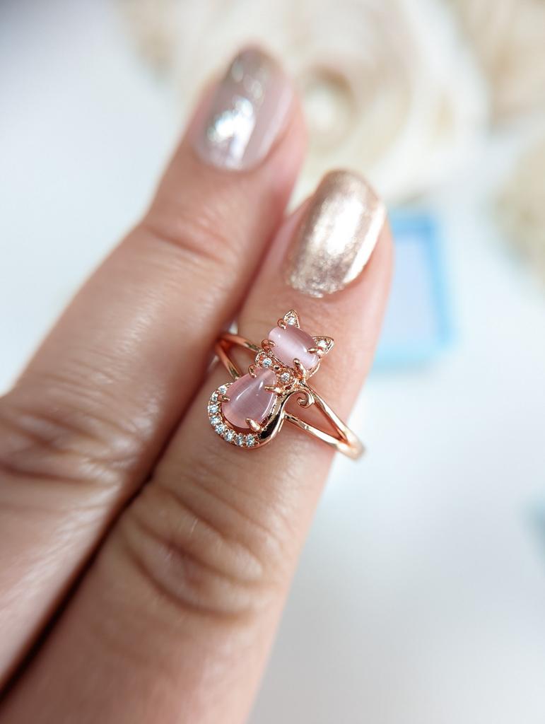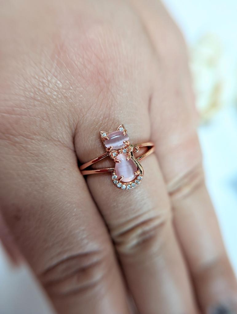 This ring is absolutely gorgeous!😻 I love kitties and this beautiful baby pink and rose gold hardware are two of my favorite colors!🥰💞 💞This is a size eight ring. It fits my finger, not too tightly however because I don't like it to squeeze my fingers. 💞 It is very comfortable! 💞It is not adjustable. 💞The rhinestone detailing is beautiful and flawless :) 💞This was delivered to me in about nine days.
