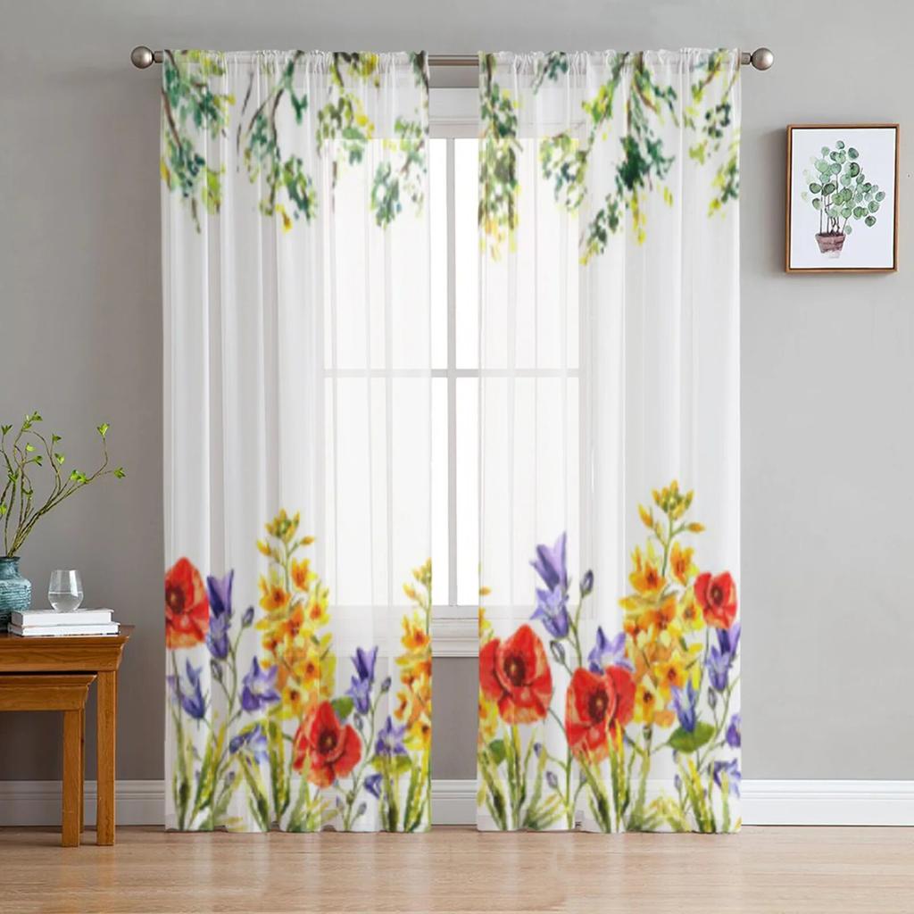 Akvarell virágok és ágak Tüll függönyök nappali dekorációhoz Modern fátyol sifon függönyök hálószoba áttetsző voile