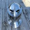Dobja fel jelmezét vagy újraalkotási gyűjteményét ezzel a lenyűgöző reneszánsz lovagi sisakkal, amely a reneszánsz kulcsfontosságú időszakaiban a lovagok által viselt páncélzat robusztus és aprólékosan kidolgozott másolata.. Ez a lenyűgöző darab kiváló minőségű 18-as méretűre polírozott acélból készült, biztosítva a tartósságot és a ragyogó felületet, amely megragadja az ősi nemes harcosok lényegét.
