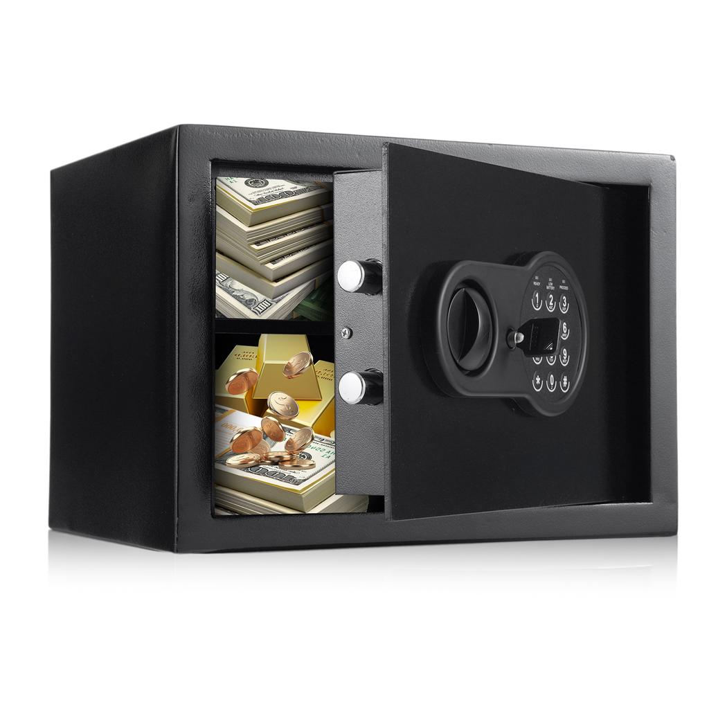 Reszponzív jelszórendszerrel és tartalék kulccsal rendelkezik. A programozható kód gyors és kényelmes hozzáférést tesz lehetővé a széf tartalmához. Nem kell aggódnia a kulcsok elrejtése vagy nyomon követése miatt. Ha elfelejti a jelszót vagy az akkumulátor lemerül, használhatja a mellékelt pótkulcsot.