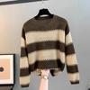 Retro kerek nyakú hosszú ujjú pulóver nőknek, divatos ingázó stílus, kontrasztos színű csíkokkal, laza pulóver, kivágott kötött pulóver