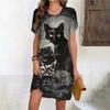 Fashion Womens Loose Black Cat Print O Neck Short Sleeve Leaves Print Loose Streetwear A-line Dress