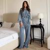 Vintage Övös Farmerdzseki Nadrágkosztüm Női Hajtókás Egygombos Csipkés Kabát Egyenes Szárú Nadrág 2025 Tavasz Laza Női Viselet