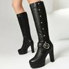 Szexi térdig érő női csizma vékony magas sarokkal, kerek orral, platformmal, divatos női PU bőr csizma, női cipő