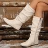 Női egyszínű, középszárú bokacsizma pliszírozott csizmaszárral és oldalsó cipzárral. Divatos női bokacsizma.