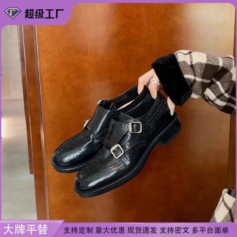 Strictly selected grape mother horse leather shrink pattern round head thick heel small leather shoes British style heightening effect loafers women's