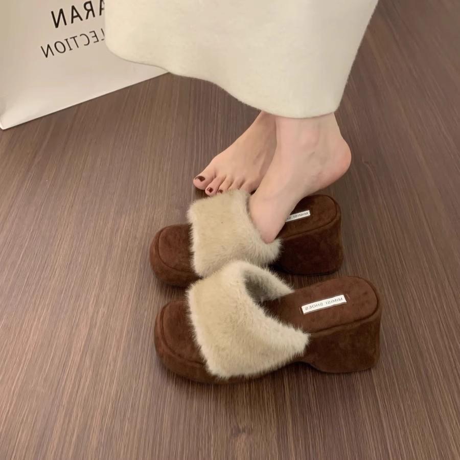Internet celebrity fairy wind leopard print mink hair one-word drag hairy shoes female outer wear thick soles heightened slope heel home cotton slipp