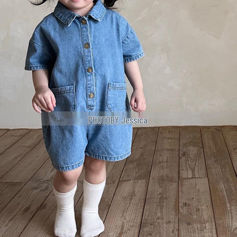 Introducing the perfect addition to your child's summer wardrobe, this trendy unisex romper is designed for infants and toddlers who love to explore. Crafted from soft cotton material, it ensures comfort and breathability during outings and crawling adventures. The romper features short sleeves, making it ideal for warm weather, while the stylish Korean denim design adds a touch of fashion-forward flair. Whether at a family picnic or a casual day out, this jumpsuit combines practicality and style for your little one's everyday adventures.