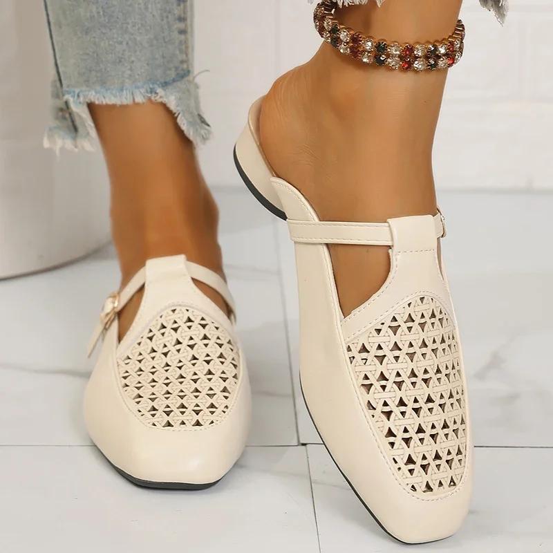 Fashion Hollow Out Closed Toe Flat Sandals Women Buckle Decor Soft Sole Non Slip Mules Slippers Summer Light Comfort Platform Beach Shoe