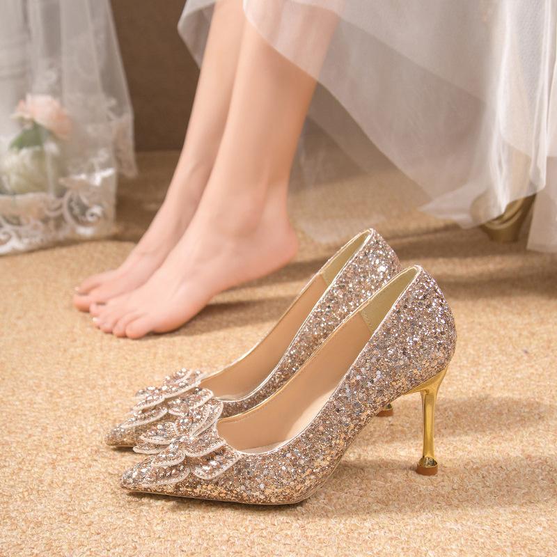 Large size Chinese wedding shoes bridal shoes new crystal sequined wedding show he thin heel pointed single shoes