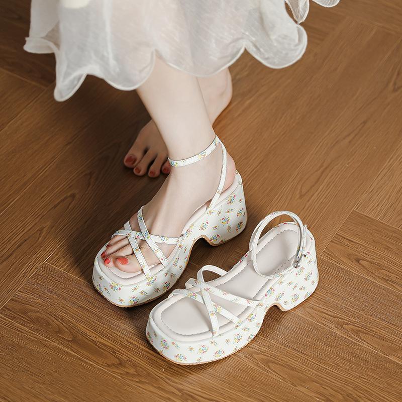 Muffin platform sandals women's summer new slope heel wear small height increase word with floral open-toed Roman shoes