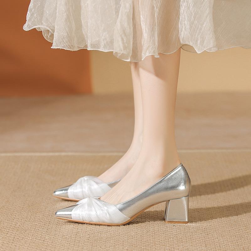 French beautiful high heels spring and autumn new silver small fragrant style pointed head light mouth thick heel with skirt single shoes women