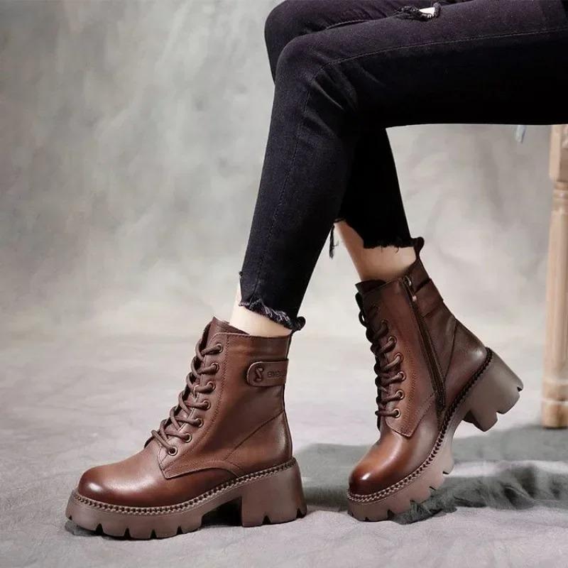 Trend Women Shoes Autumn Non-slip Leather Boots Zip Round Toe Shoes for Women Concise Leisure Sewing Platform Boots Botas Mujer