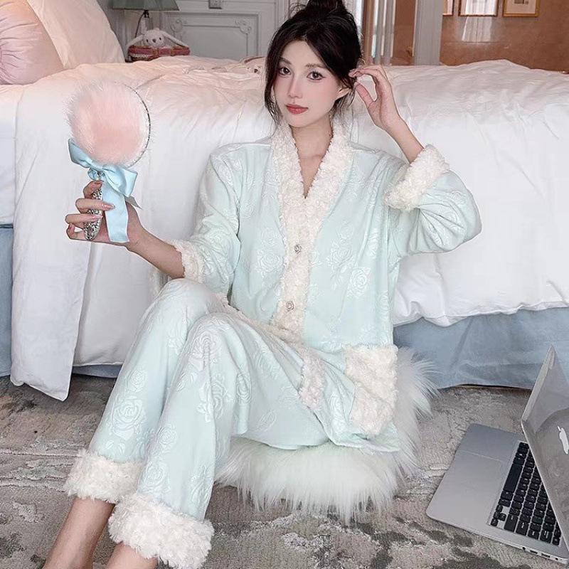 Women's Rose Fleece Pajama Set - Long Sleeve & Pants, Autumn/Winter Style