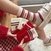 Women's Big Red Christmas Socks: Year of the Horse, Cute Polka Dot Bow, Lace Fabric, Striped Mid-Calf Design
