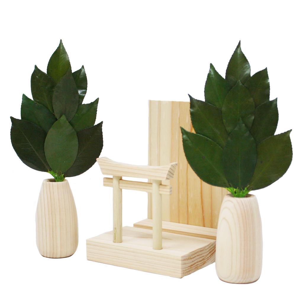 These sakaki trees are made from high-quality preserved camellia leaves from Tanba, allowing for long-term use (approximately one year or more) without the need for replacement. A unique manufacturing process (Utility Model No. 3222297) prevents the leaves from losing their shape. This set includes two round sakaki stands and a Shinto altar, all made from Japanese cypress.