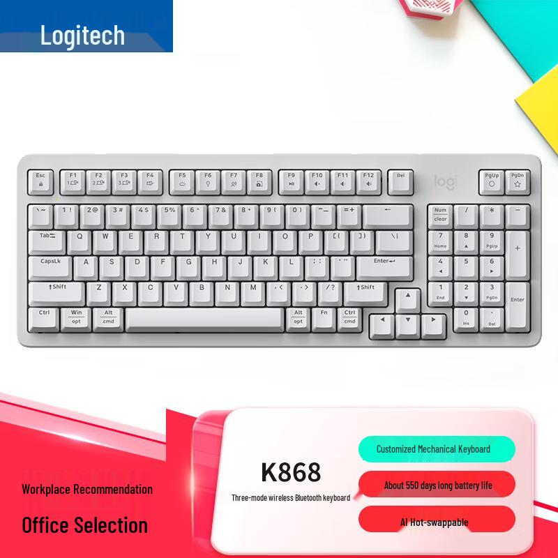 The Logitech K868 is a versatile triple-mode (wired, 2.4G wireless, Bluetooth) customizable mechanical keyboard. Designed for enthusiasts, it features full-key hot-swappable switches, allowing for personalized typing experiences. With a long-lasting rechargeable battery offering approximately 550 days of use, and various backlighting modes, this keyboard provides excellent performance and flexibility for multi-system compatibility.