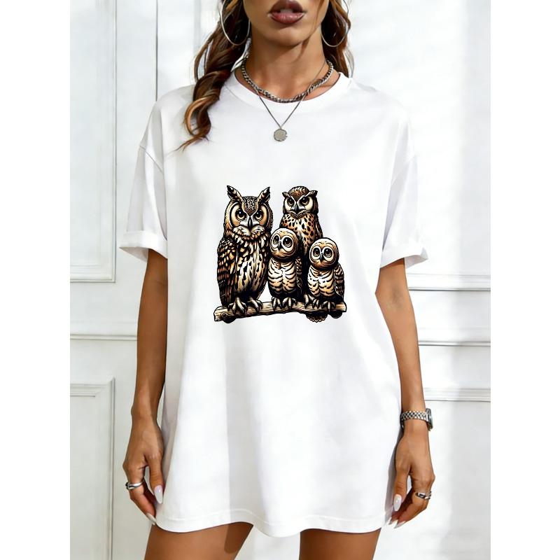 Túlméretezett póló fekete bagolycsalád mintával hétköznapi viseletre
