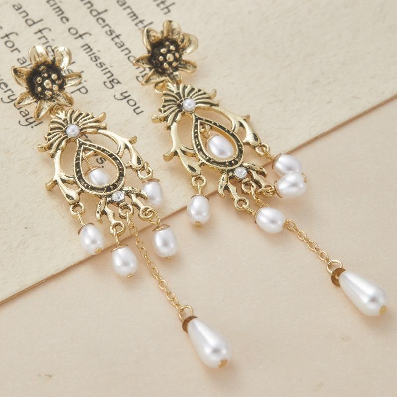 2 db Vintage Virág Csepp Üreges Bírósági Stílusú Műgyöngy Fém Arany Színű Többszínű Női Bojtos Lógós Fülbevaló