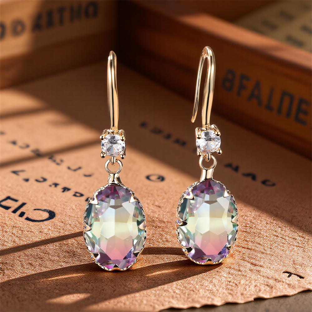 Oval Stone Rainbow Crystal Long Dangle Earrings For Women Vintage Gold Color Multicolor Zircon Drop Earring Wedding Jewelry Gift
