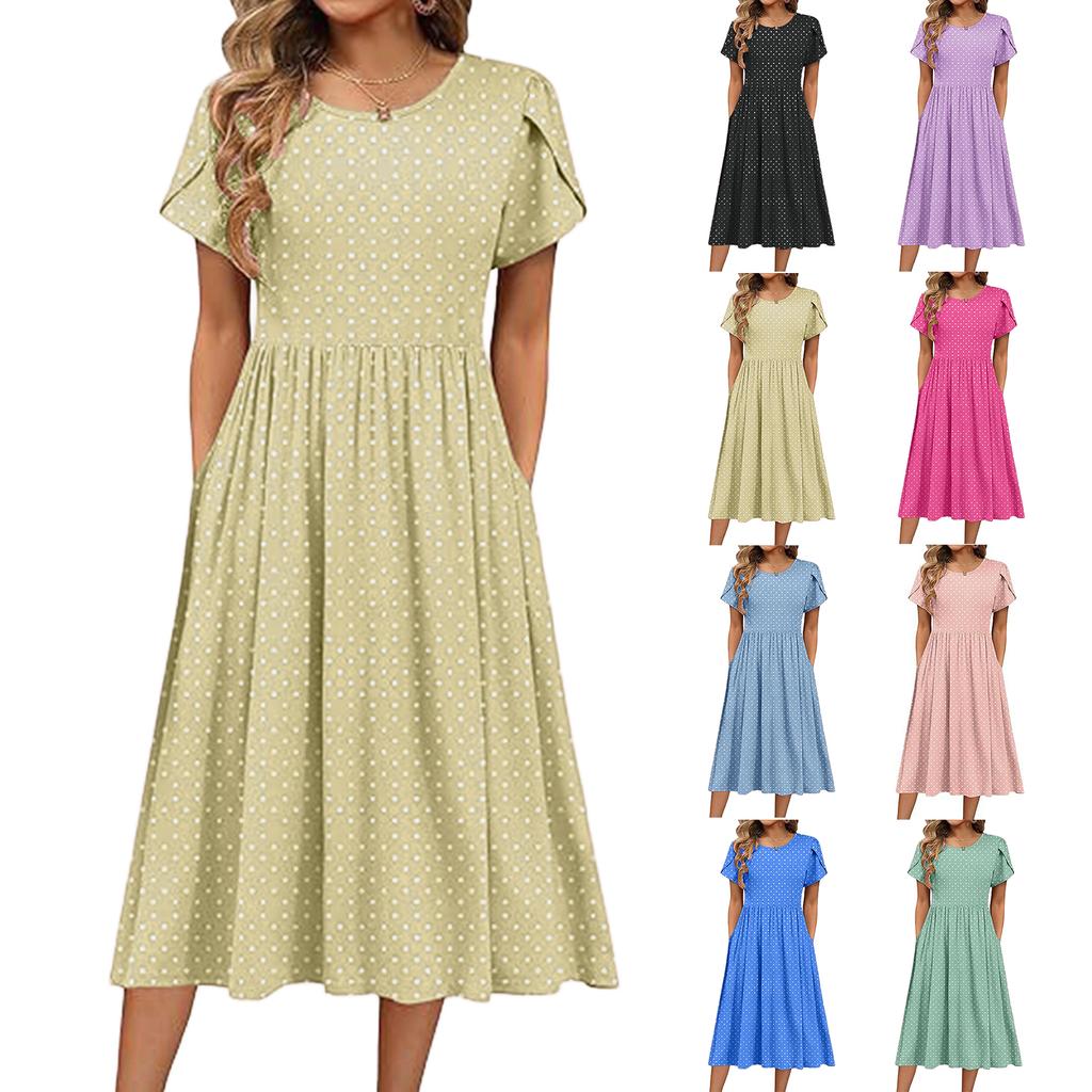 Women's Fashion Spring And Summer Dress Casual Short Sleeve Round Neck Petal Long Printed Dress