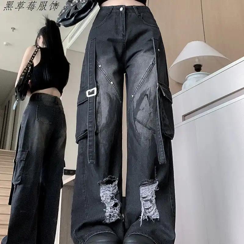 American Retro Black Denim Trousers Female Cargo Pocket Wide Leg Pants High Street Ripped Distressed Buckle Decoration Jeans New