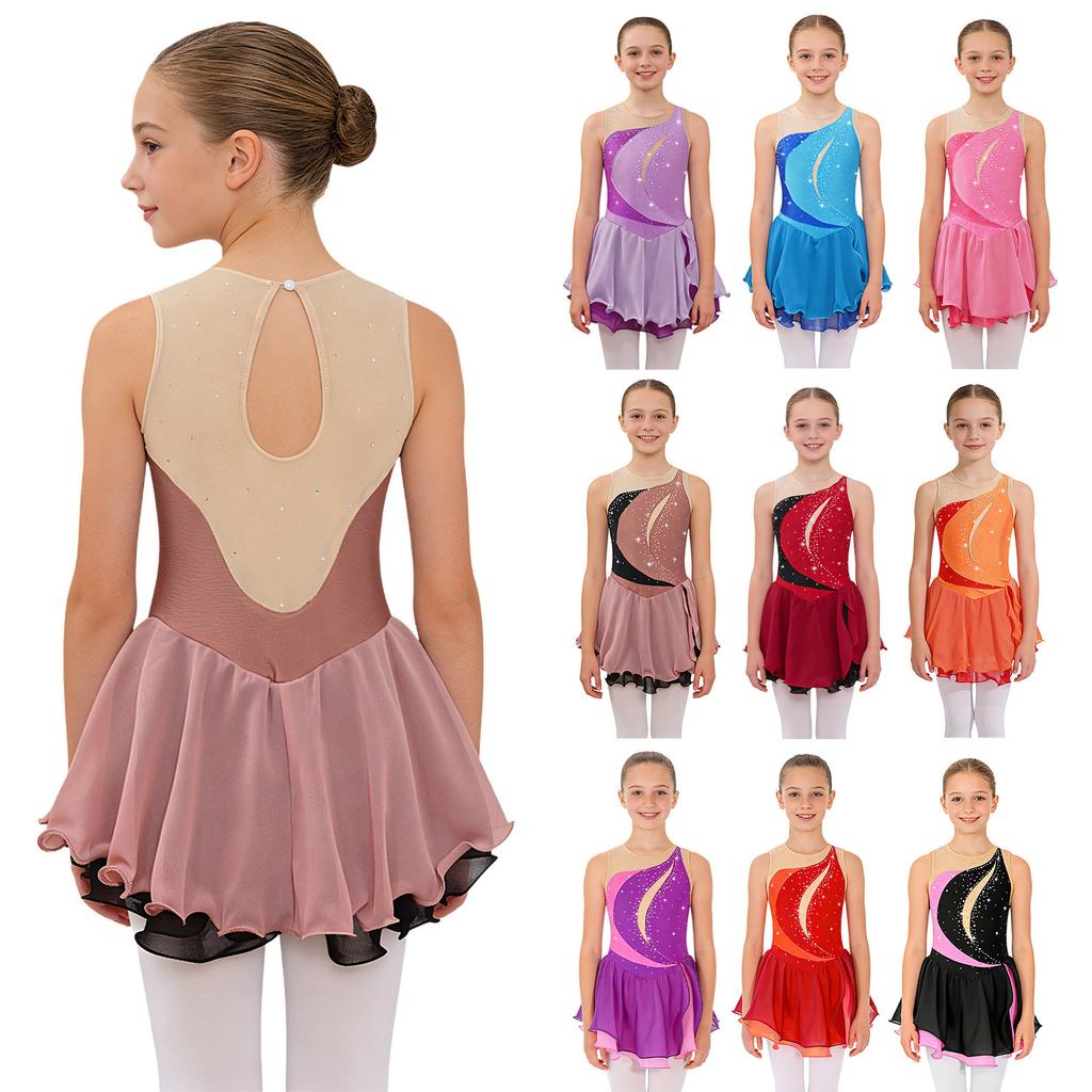 Gyerek lányok ujjatlan hálós patchwork strasszos műkorcsolya ruha balett trikó Tutu ruha táncruházat