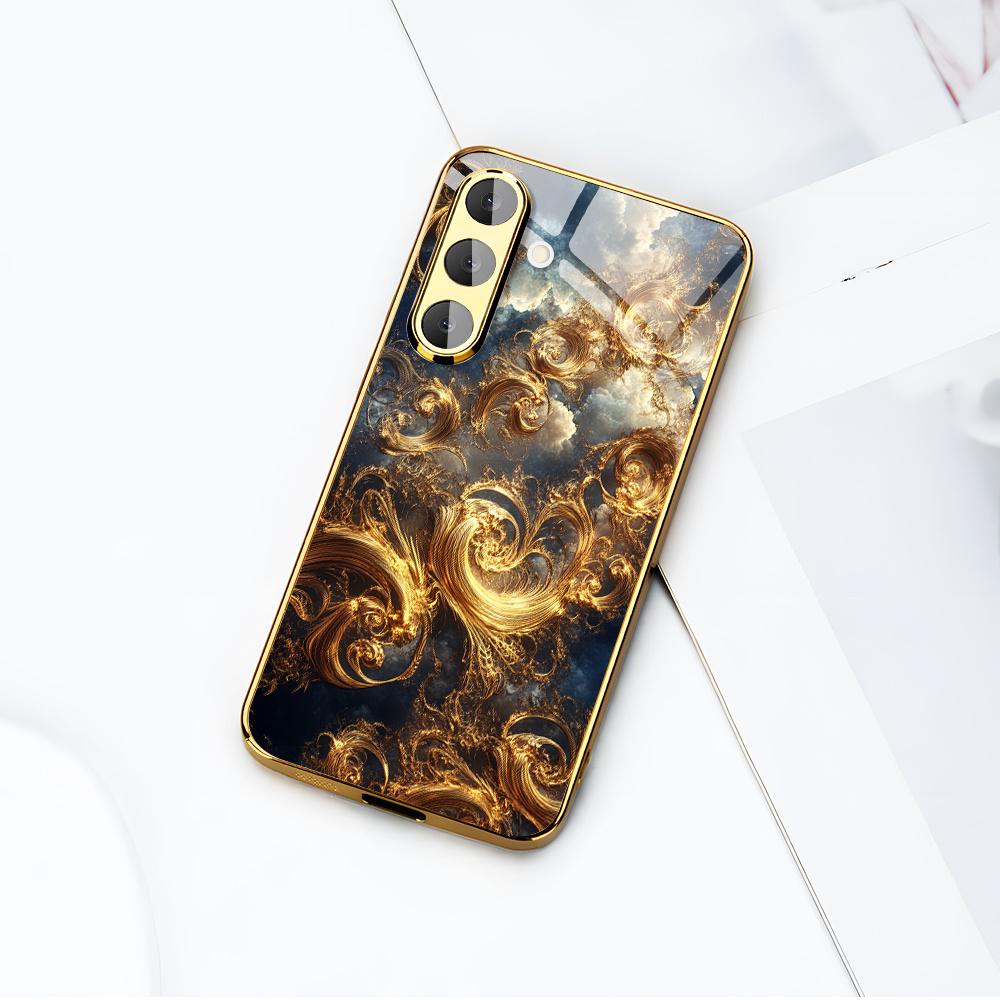 Gold-plated tempered glass phone case, compatible Galaxy S26, S25, S24, S23, and S22 Ultra Plus. Features a gold textured design