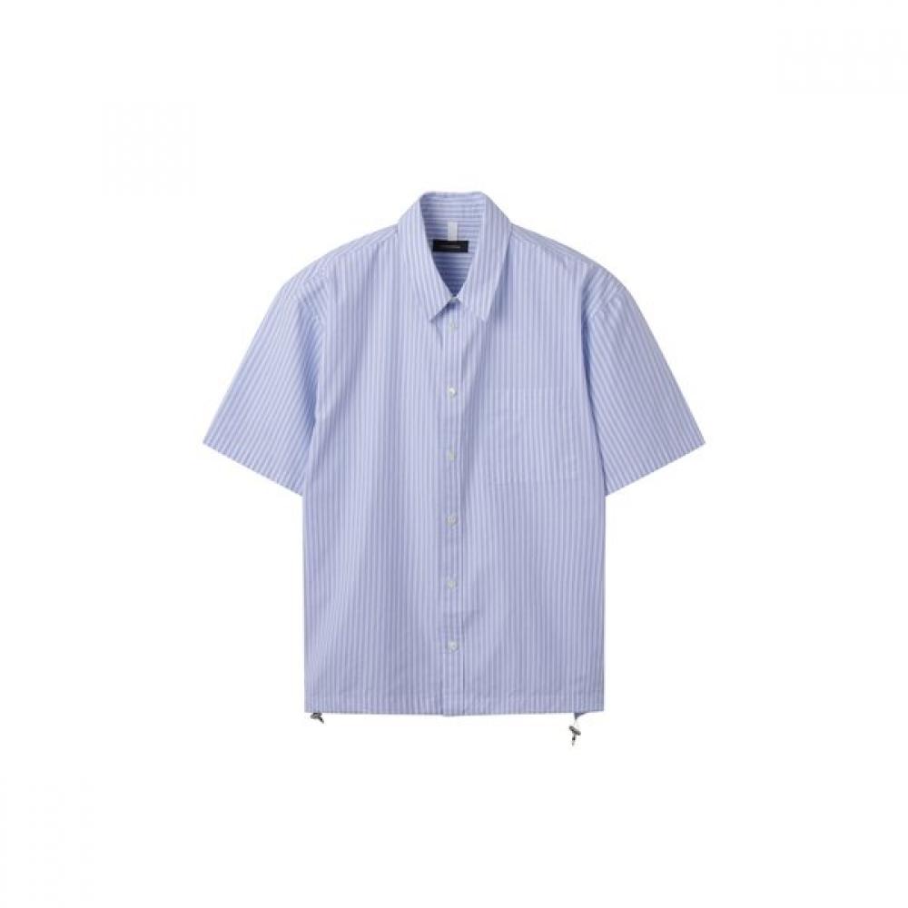 The Blue 2-Color Detail Half Shirt (Stripe) features a unique hidden henley neck double collar design, allowing for various silhouettes through the use of the hem string. Made from 100% cotton striped fabric, it offers a soft and refreshing texture. With an oversized fit silhouette, it allows for stylish presentations.