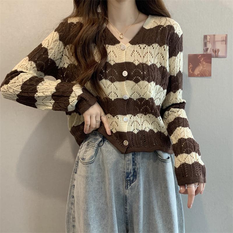 Spring and Autumn retro striped hollow knitted cardigan fashionable small fresh and thin foreign top long sleeve knitted sweater