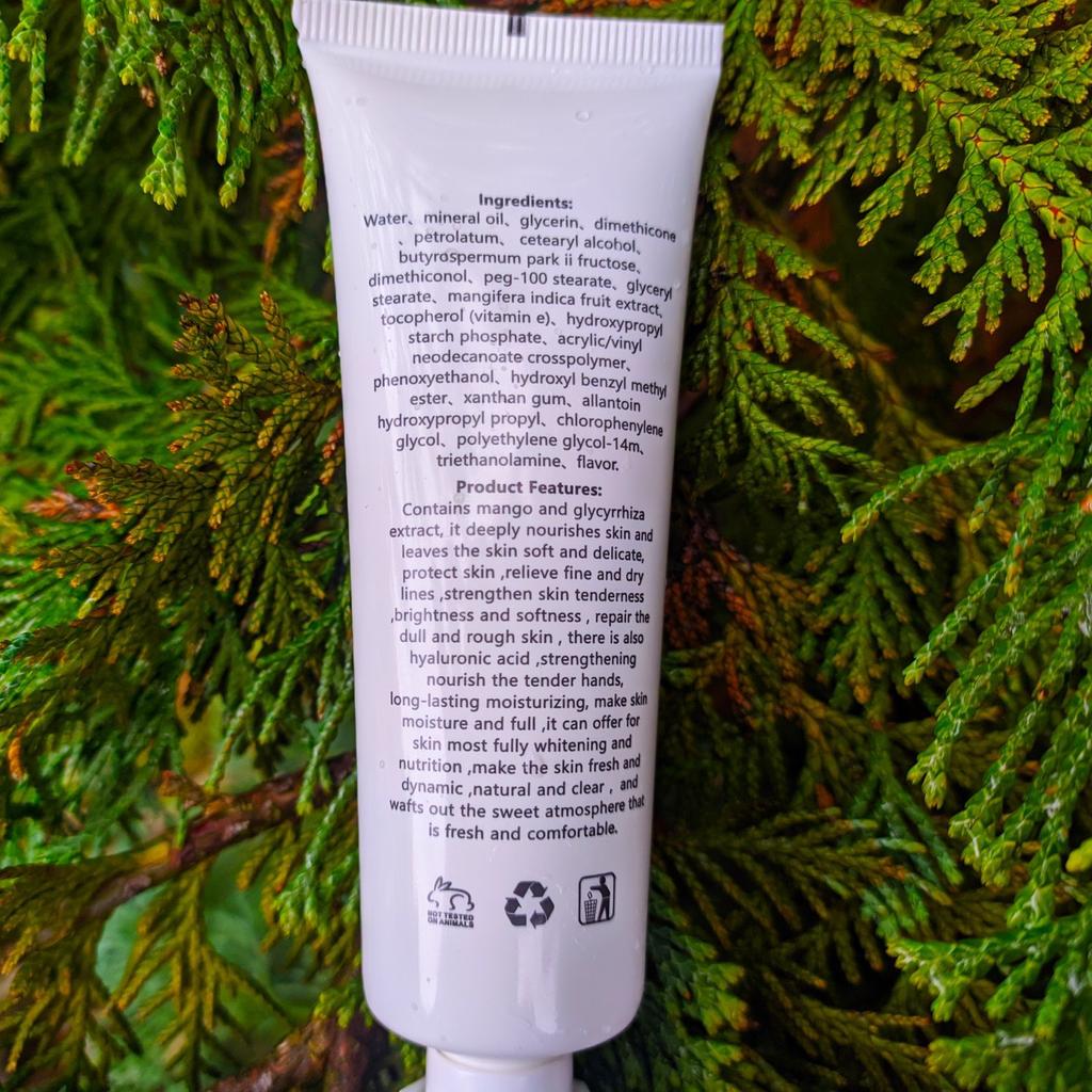 მდიდარია მანგოს და გლიცირიზის ექსტრაქტით, ღრმად კვებავს კანს, აუმჯობესებს წყლის ნაკლებობით გამოწვეული უხეში და წვრილი ხაზების წარმოქმნას. ის ასევე შეიცავს ჰიალურონის მჟავას, შეუძლია გააძლიეროს და კვებავს ნაზ ხელებს და ატენიანებს კანს დიდი ხნის განმავლობაში. გახადეთ ხელები სქელი და ელასტიური, ნაზი და გამჭვირვალე და გამოსცემს ახალ, კომფორტულ და სასიამოვნო სურნელს.