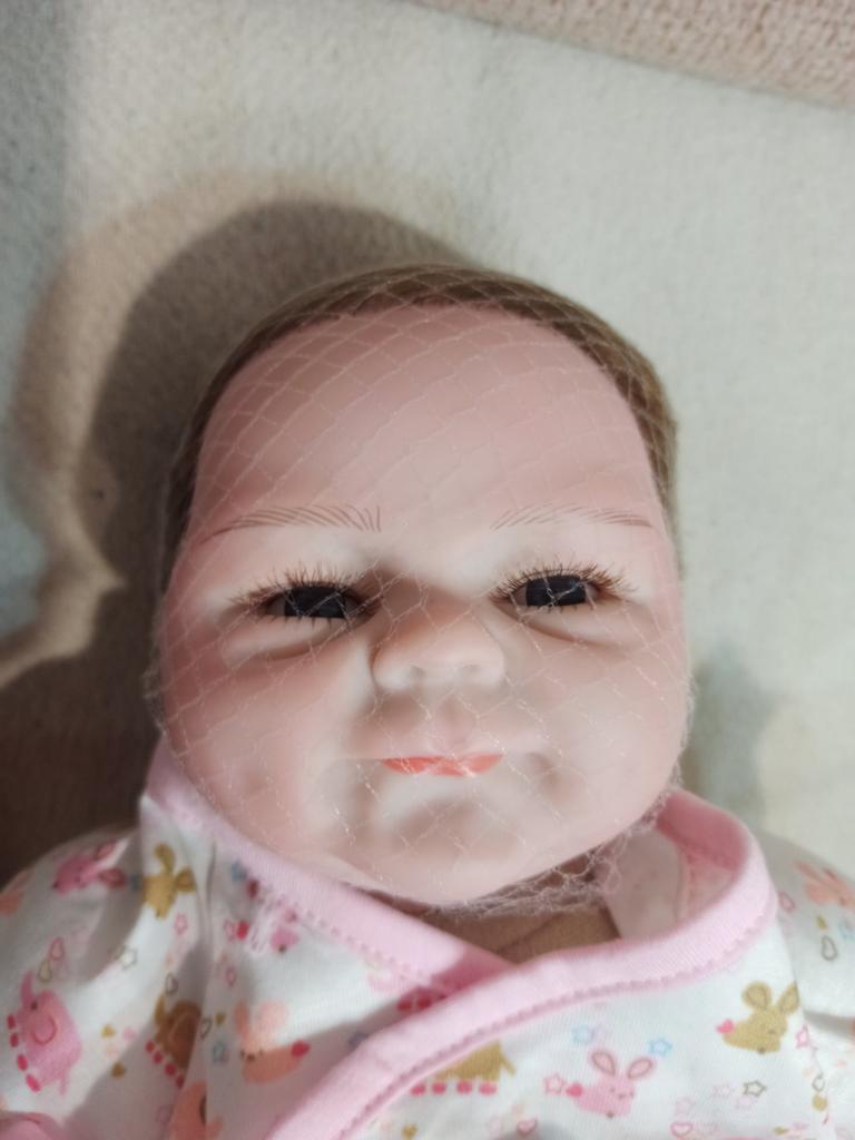 Jeg likte ikke helt fargen: For mye rødt, og skarpe overganger mellom rødt og hvitt. Benet er sydd litt skjevt på. Men totalt sett er dukken bra. Inkluderer bleie, babyvest, teppe, lekekanin, flaske og smokk