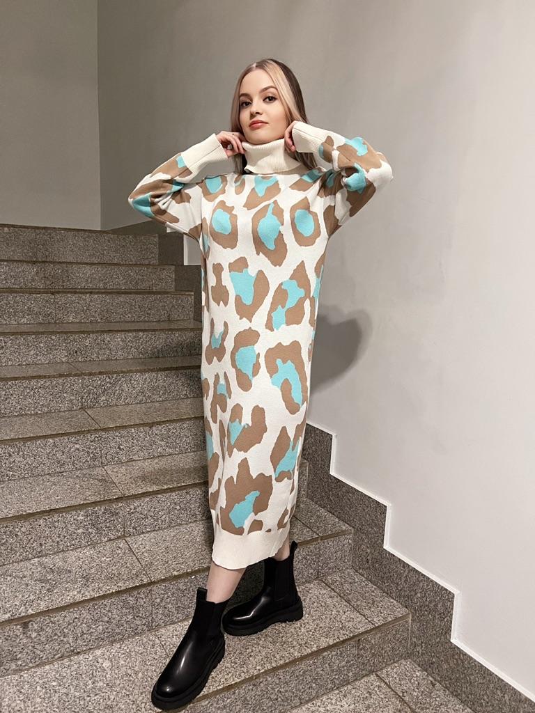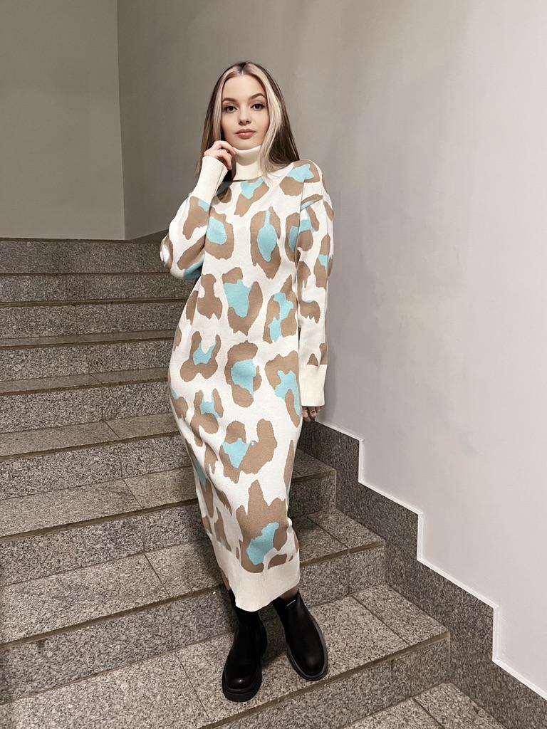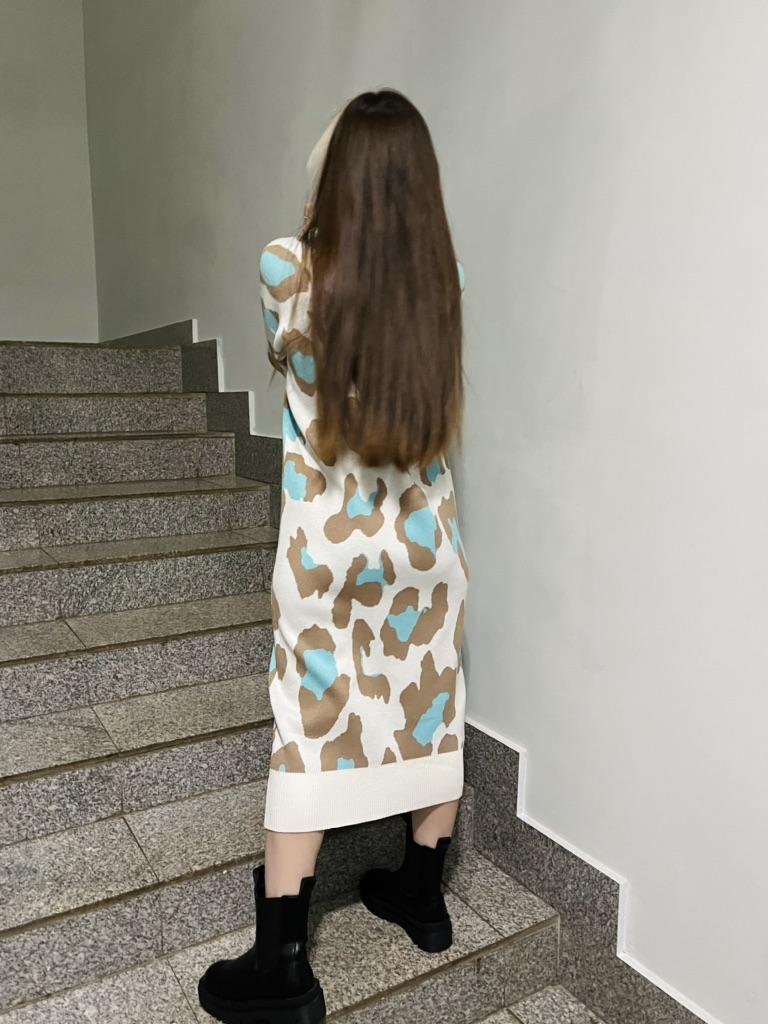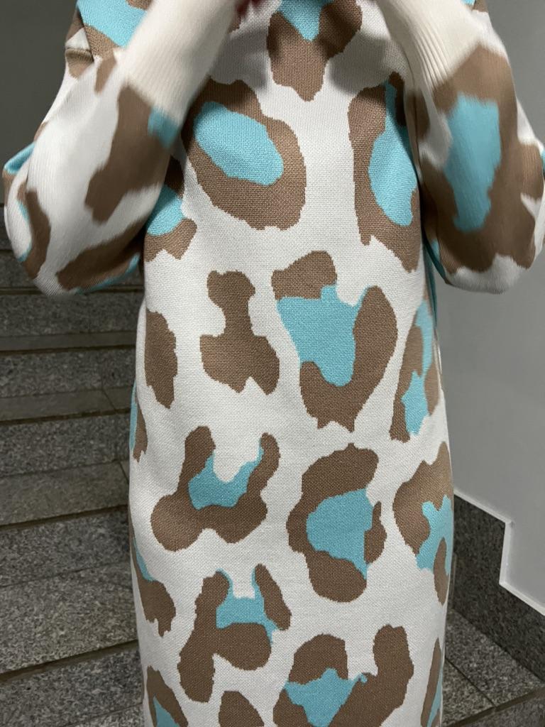 Høst Vinter Kvinner Lang Høy Krage Bunn Strikke Kjole Leopard Print