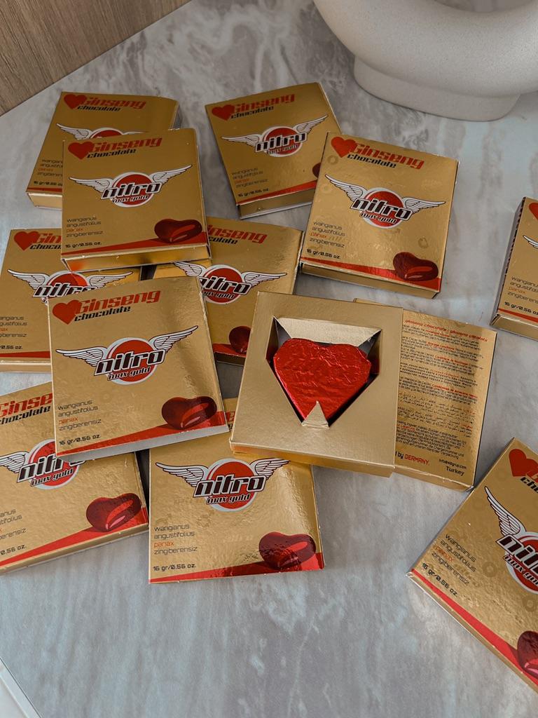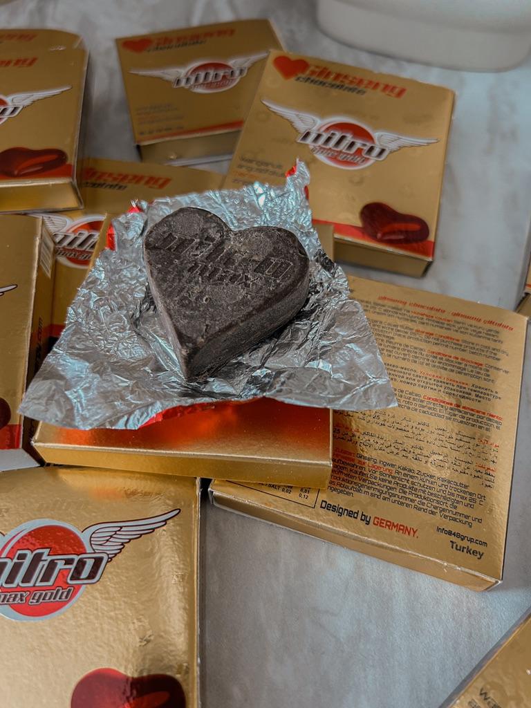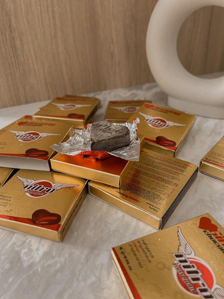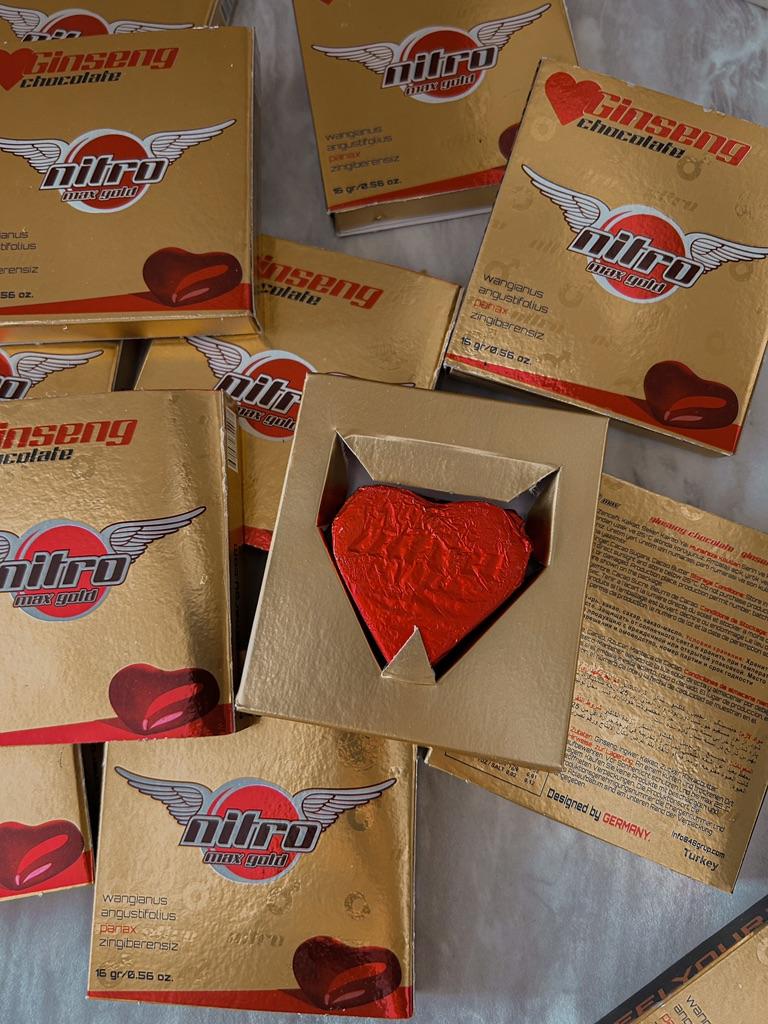 Tyrkiske søtsaker 🍫 Dette sjokoladeafrodisiakum er en ekte smak for gourmeter. Flisen har form som et hjerte, innpakningen er papir, designet er behagelig. Det er 12 stykker av 16 spill i en boks. Inneholder naturlige ingredienser. Mørk sjokolade med tillegg av ginseng, som er kjent for sine styrkende og stimulerende egenskaper, samt en positiv effekt på immuniteten. Ikke alle liker sjokolade. Bare de som liker noe uvanlig og litt spesifikt vil kunne nyte smaken av sjokolade.