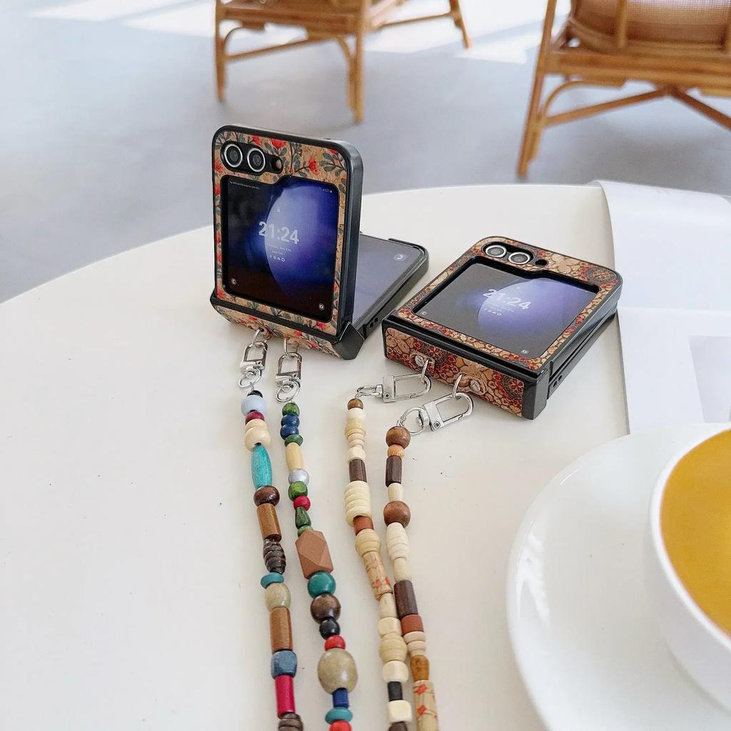 Crossbody Lanyard Retro Floral Prints PU Leather Cover with Glitter Bead for Samsung Galaxy Z Flip 6 5 4 3 Phone CaseFeature: