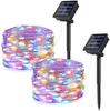 Specifications: 100 LED bulbs, 2 x 10m length, 8 lighting modes, IP65 waterproof rating, solar-powered, weight: 135g, charging time: 6-8 hours, runtime: 8-12 hours steady light, 10-15 hours flashing. Perfect for Christmas, parties, Halloween, and other occasions. The copper wire is flexible yet durable, making this solar-powered string light easy to arrange and perfect for any season.